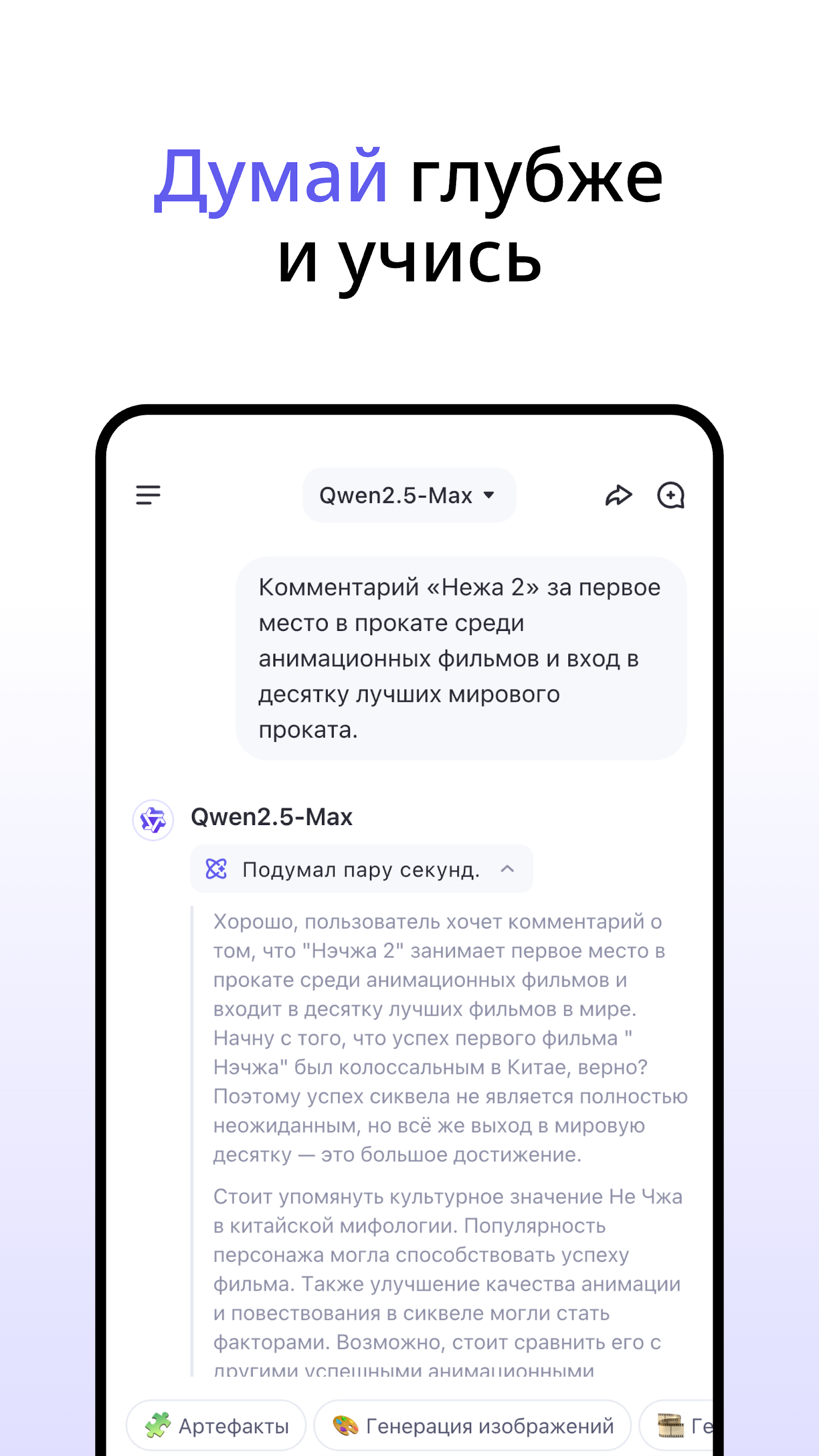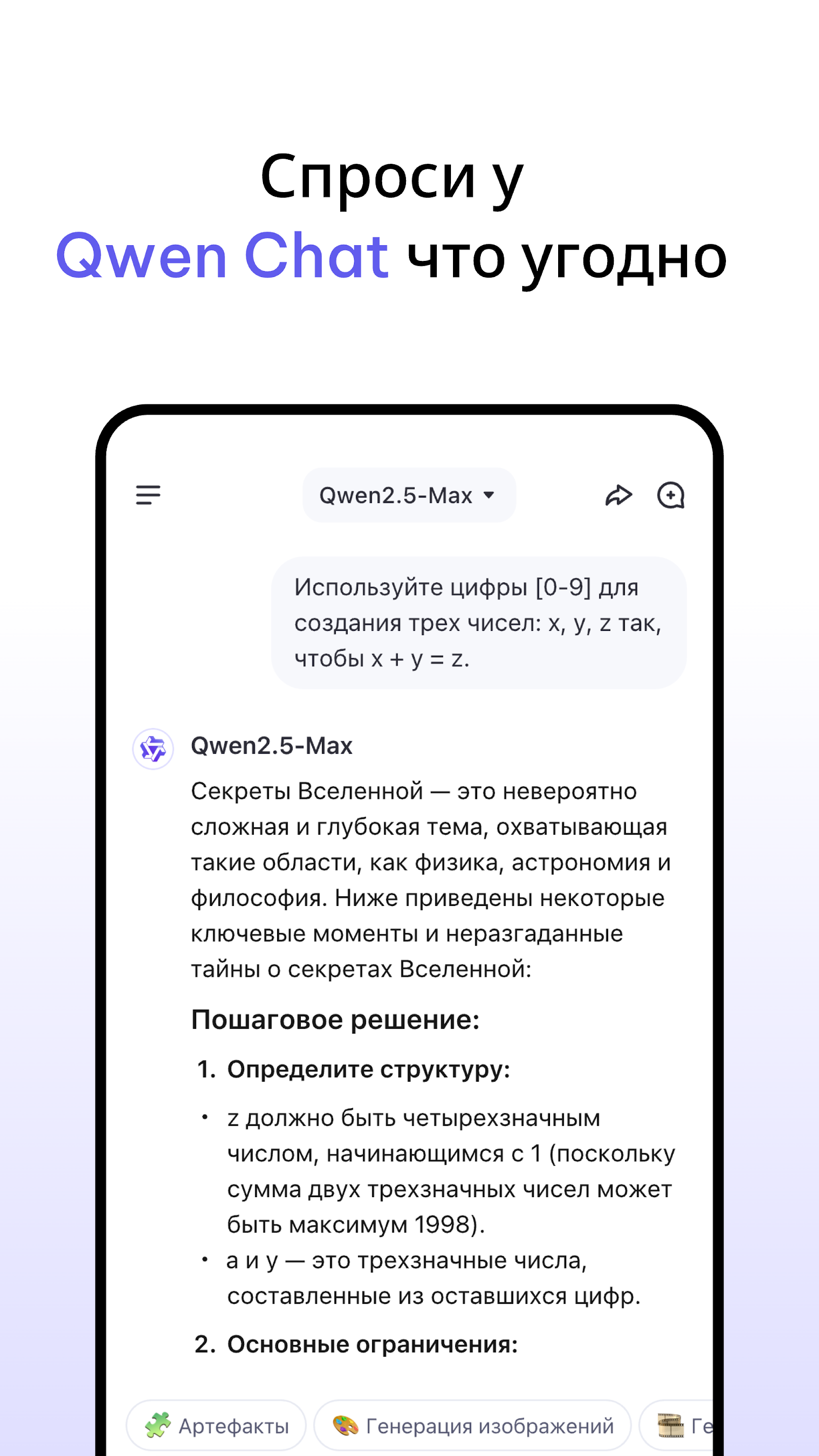 Глубокое размышление и решение проблем Благодаря технологии QwQ, Qwen Chat демонстрирует исключительные способности в сложном анализе и решении проблем.
